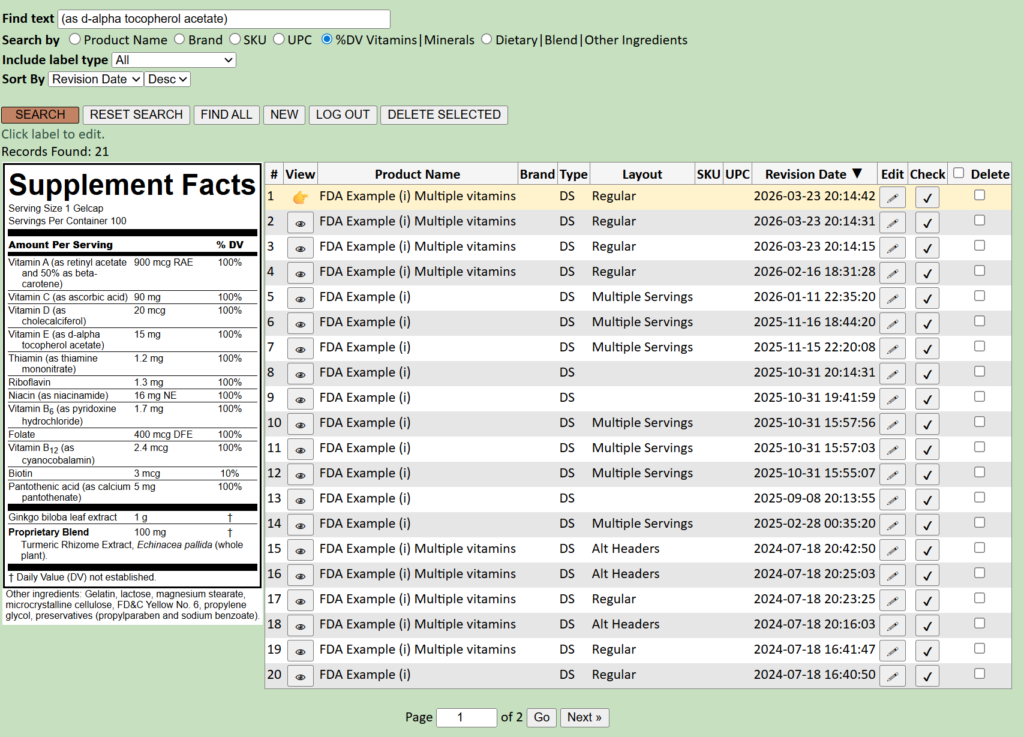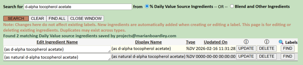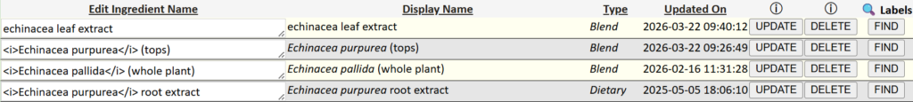 If you need to make changes to the labels themselves, choose 🔍FIND. This will automatically open a new search tab, with a list of all the labels that contain that item in a blend, as a dietary ingredient, or as an “other ingredient”. NOTE: You can also find labels with specific ingredients directly from the new Search page, see this post.